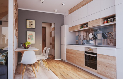 在室内餐厅的局部墙面,使用与小区室外用的瓷砖同类的墙砖,形成与室外社区公共空间浑然一体的效果,令人在潜意识里有置身室外空阔空间的错觉,以此扩大室内空间。此法事实上是采用了借用空间的手法,还能由此体现出室内外相互融合的作用。