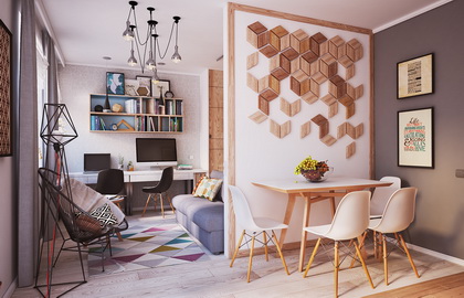 独立的小餐厅一般难以形成良好的围合式就餐环境。此法针对这一问题,在小餐厅的上方天花上做小型的方型吊顶以压低就餐空间,营造餐厅的围合式就餐气氛;同时将吊顶和吊灯合二为一,由于吊顶的作用,此处可以选择价格便宜的吊灯,但借助吊顶的“气势”,完全可以烘托就餐的主题,并且满足了空间、照明等诸多功能需求。